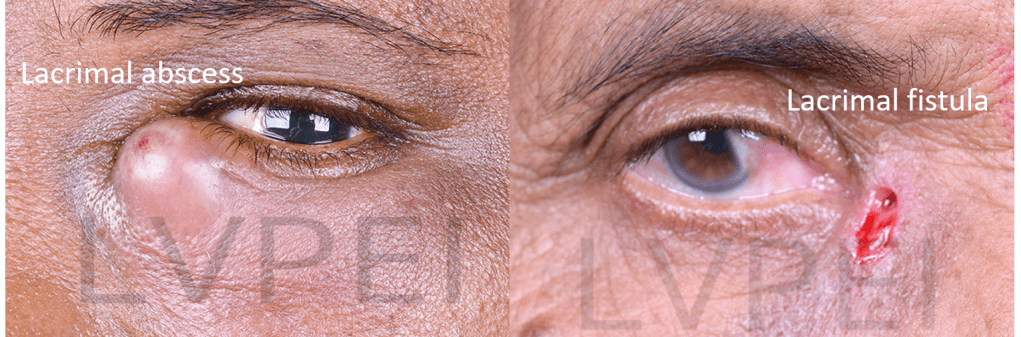 This pain is intense and the swelling is red and tense and can extend to involve the entire lower eyelid. There can be pus formation in the area (Lacrimal abscess). Sometimes, the swelling can break open onto the skin leading to evacuation of the pus and formation of a fistula from the tear pathway to the skin (Lacrimal fistula).