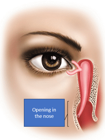 Tears from the eye drain into the nose via the tear drainage pathway (lacrimal drainage system). This pathway is like a pipe from the eyelid, which opens into the nose.