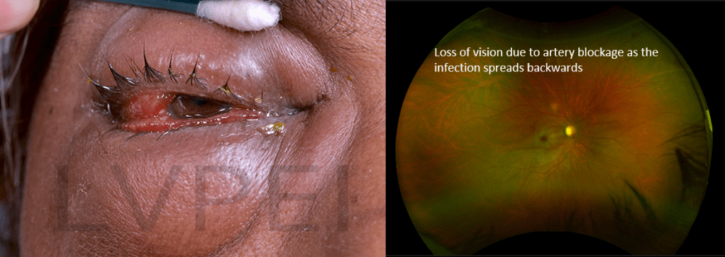 In rare instances, the infection can spread backwards and around the eye and cause decrease or loss of vision.